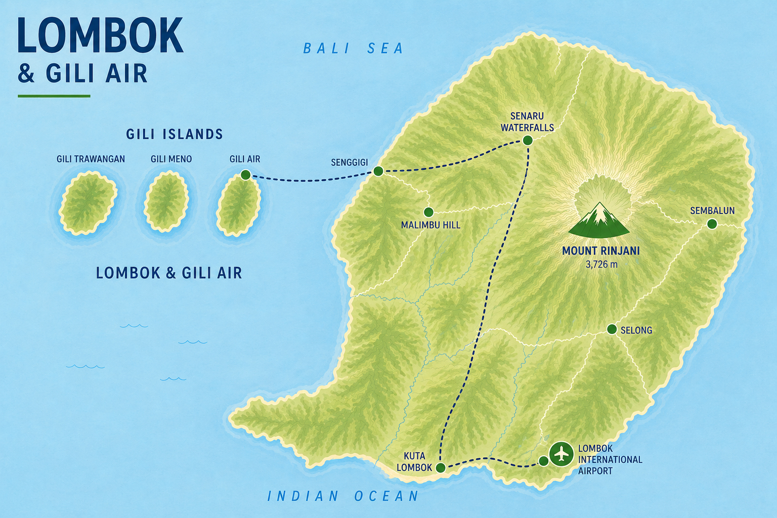 – 1 Night stay at Sengigi, Gili Air, Senaru, and Kuta, Lombok each ( Double / Twin Sharing )